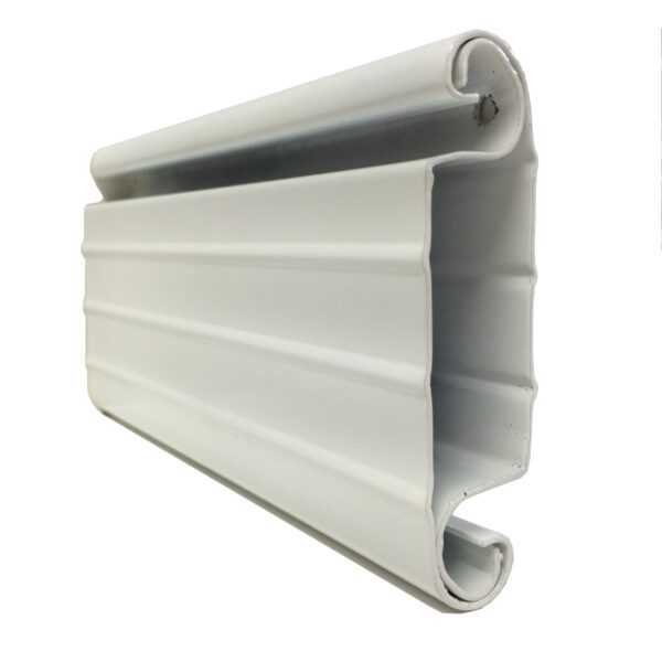 Double skinned polyester powder coated 95mm flat steel slat with polystyrene foam insulating core.